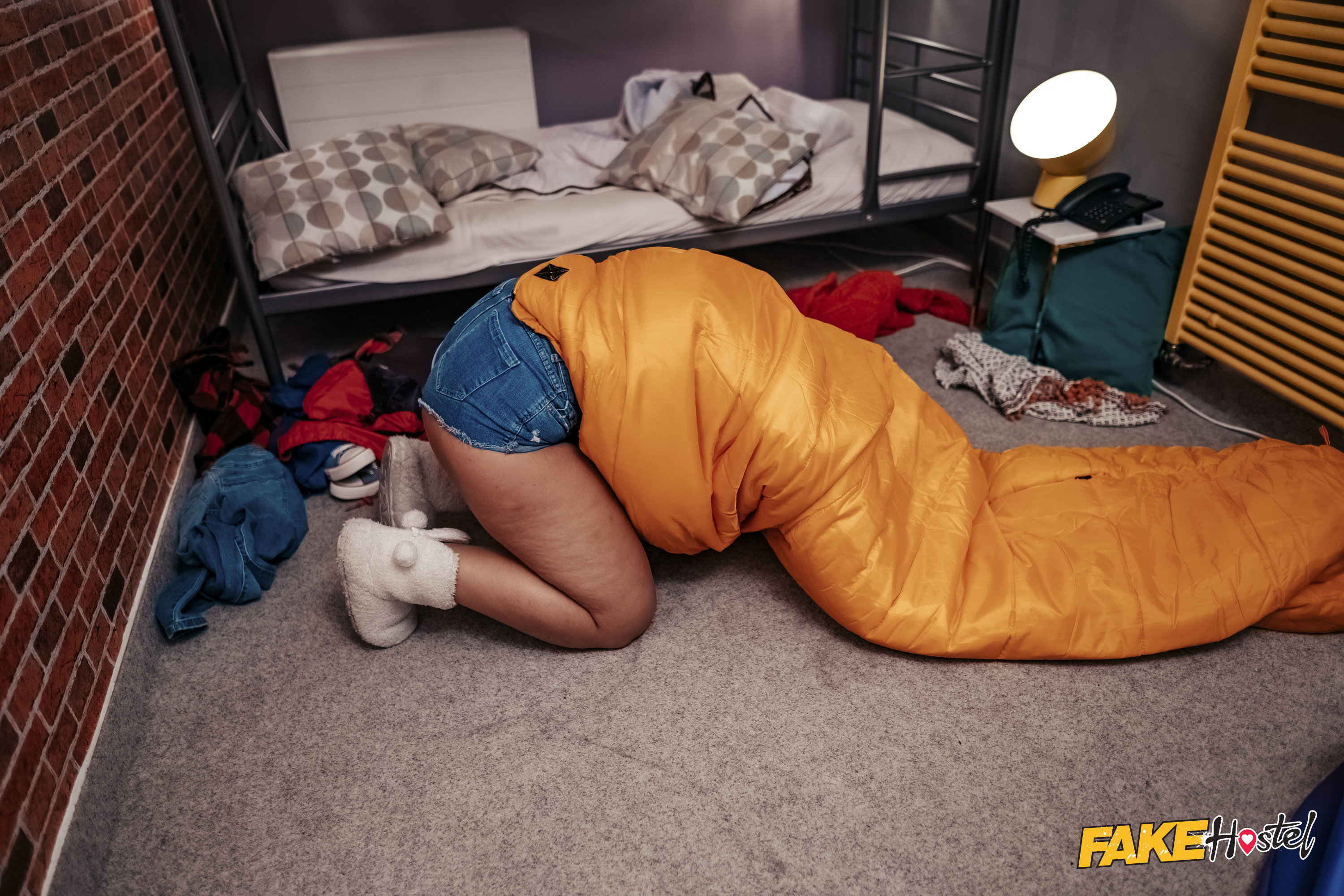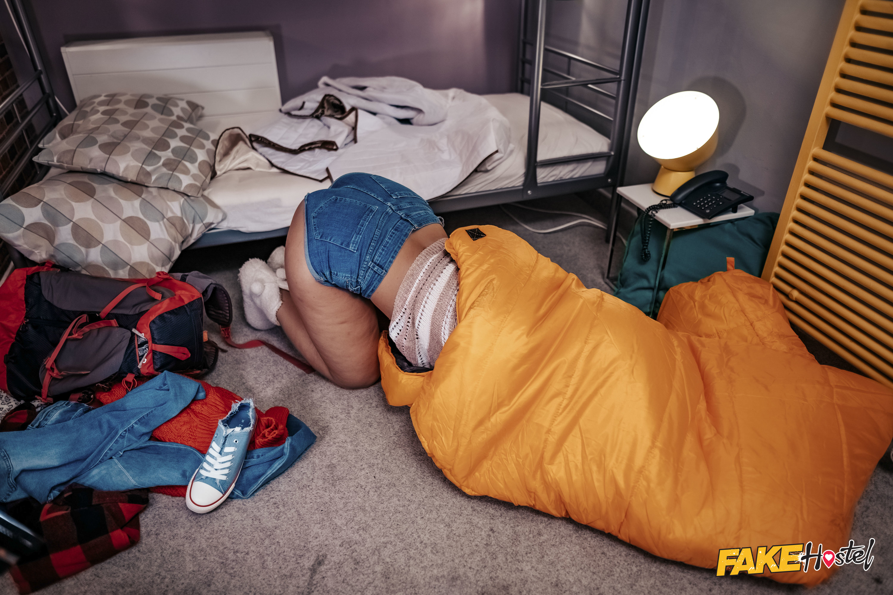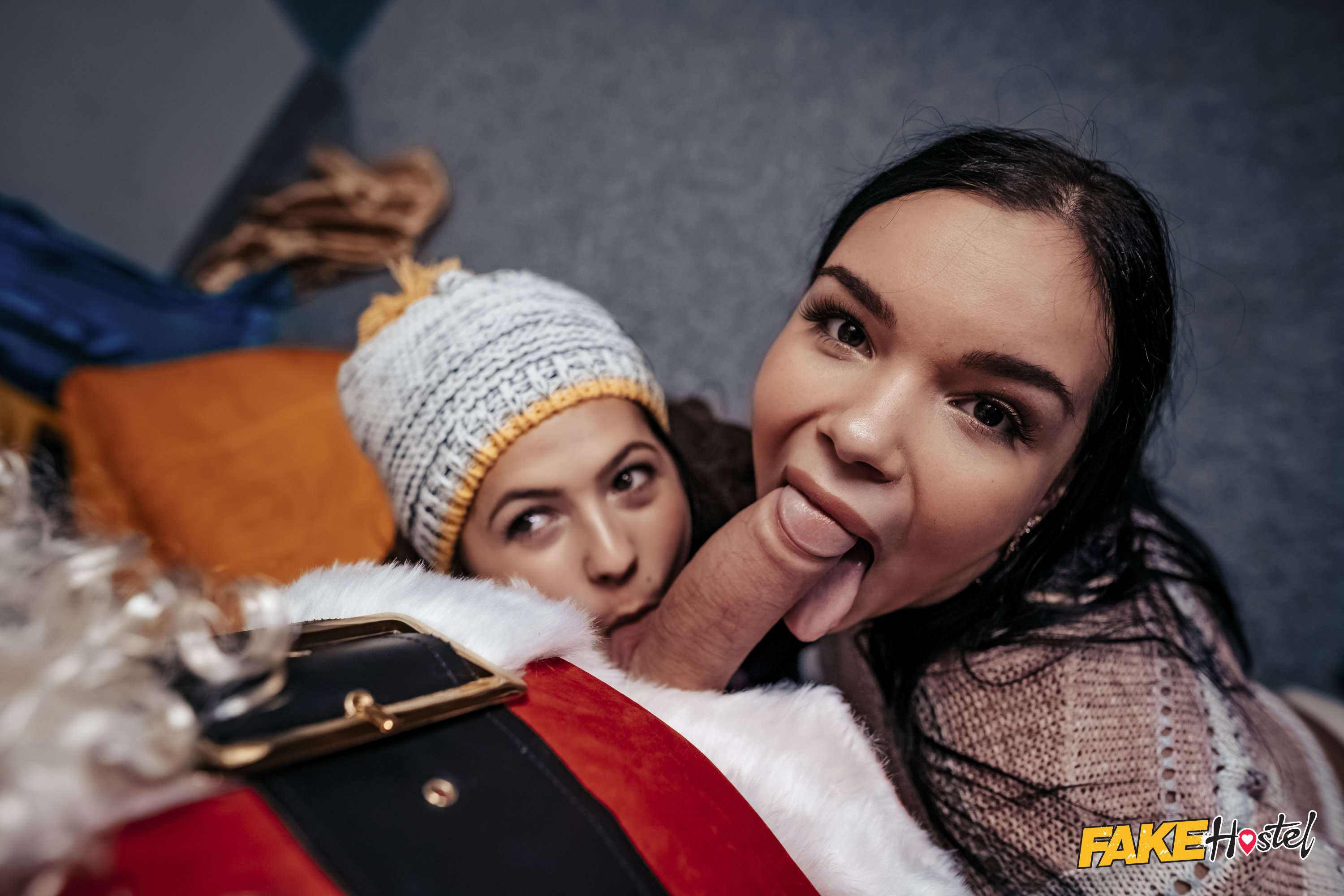 Sofia Lee is packing her bags in the Fake Hostel when she realizes she has lost her passport! Searching her back pockets and surrounding area, Sofia looks into her sleeping bag... and somehow gets stuck. Flailing around the Fake Hostel looking for help, Sofia stumbles upon Sereyna Gomez and Charlie Dean as they decorate a Christmas tree. Charlie is dressed like Santa, and as they help Sofia out of her sleeping bag, he gives her the gift of orgasms! Pulling down her shorts, Sereyna licks Sofia's pussy from behind, then they manage to get her free of the dastardly fabric. Sofia takes off her shirt to reward the couple with the sight of her big boobs, then they share a passionate festive fuck beneath the tree!