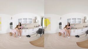 Antonia and Lena playfully unpack groceries in the kitchen, teasing each other with a courgette. Their laughter turns into passion as they engage in intimate acts, culminating in mutual pleasure using a dildo in various positions.
